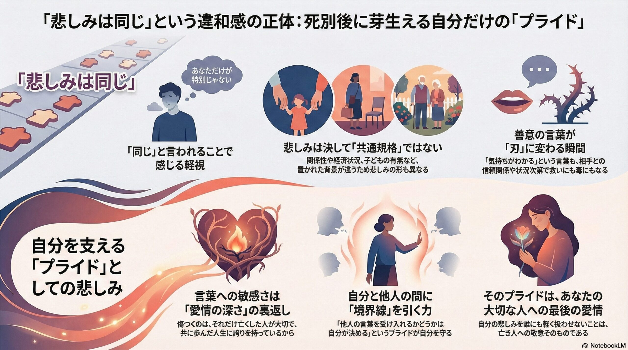 もし、あなたが今、誰かから「悲しみは同じ」とか「気持ちは分かる」と言われて、モヤモヤしているなら。