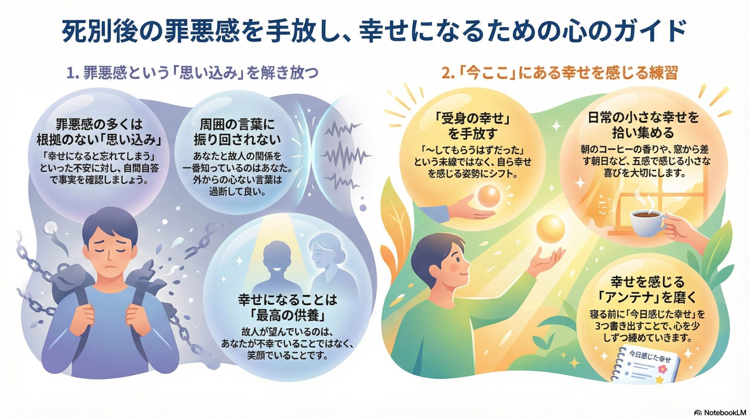 死別後、多くの人が「私だけ幸せになっていいのだろうか」という罪悪感に苦しみます。