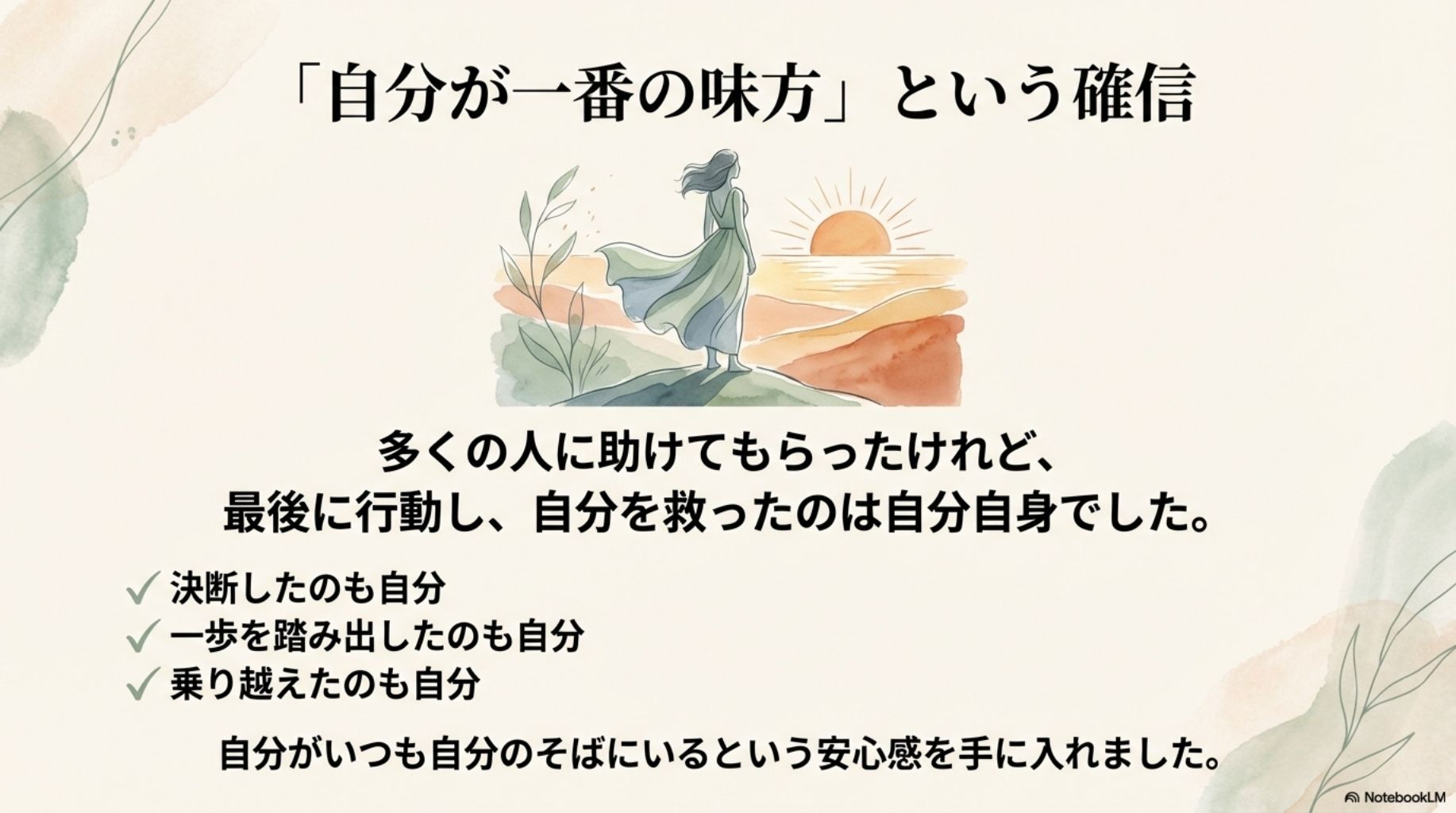 それは、自分が一番の味方で、自分がいつも自分のそばにいるということを実感できることです。